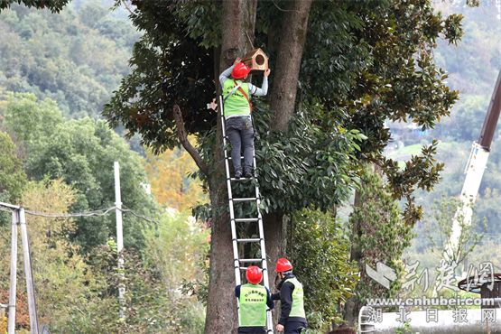 工人们在森林里安放鸟巢。通讯员供图