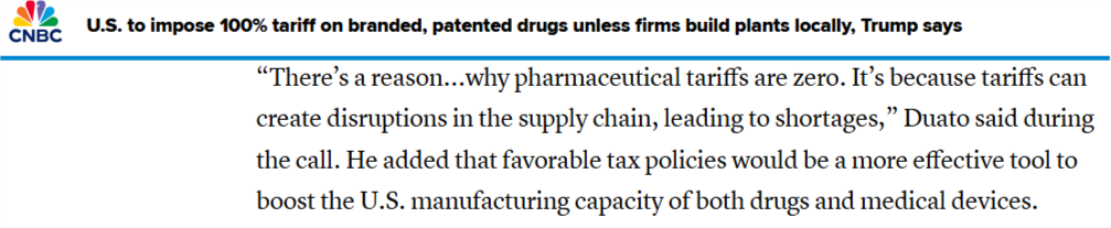 自今年4月以来,白宫威胁要对26号的报告征收进口毒品的关税,税收增加是“意想不到的打击”。许多制药公司警告说,此举可以推动成本,干扰药品供应链,并最终使美国患者处于危险之中。一些卫生政策专家还指出,税收增加将推动某些治疗的成本,甚至使涵盖美国的药物缺乏毒品。该报告引用了约翰逊和约翰逊首席执行官乔Aquin Duato说:“这就是为什么毒品关税曾经为零的原因。”