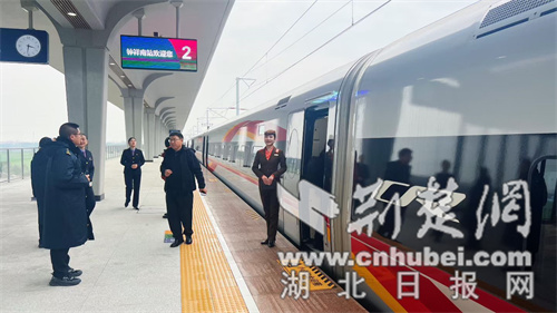 媒体记者在钟祥南站登上列车试乘。记者 安从斌 摄
